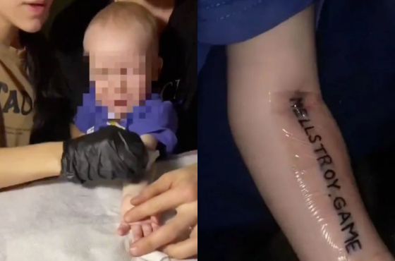 Las imágenes muestran al bebé siendo tatuado con la frase “Mellstroy.Game”, nombre de la plataforma del influencer. Hasta el momento, Mellstroy no ha emitido comentarios sobre el caso.