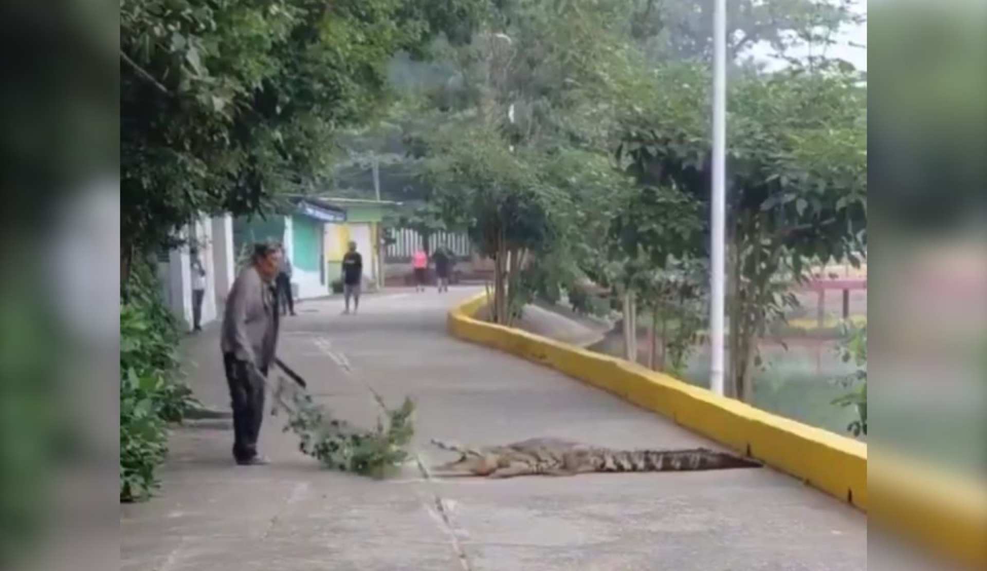 Minutos después, un hombre del barrio decidió intervenir para evitar que el cocodrilo siguiera avanzando hacia áreas habitadas. En el video se le ve con un machete, acercándose lentamente y midiendo cada paso. Intentó intimidar al reptil con gestos, pero el animal apenas reaccionó. Al notar que no funcionaba, buscó una alternativa más segura.
