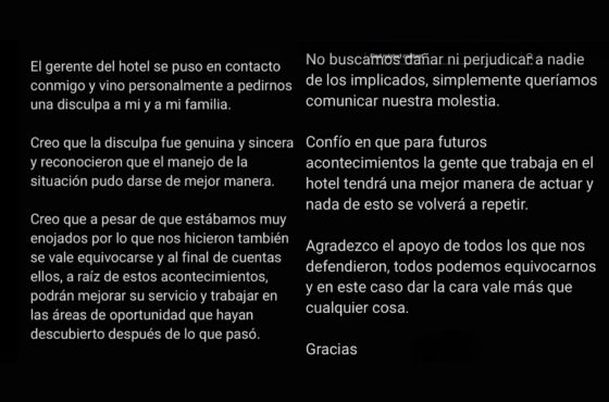 Tras el incidente, el hotel ofreció disculpas públicas. Según el padre afectado: