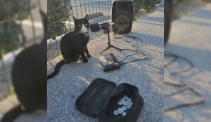 El pequeño gato tuxedo, de porte elegante y mirada expresiva, ha logrado atraer la atención de decenas de personas que se detienen a escuchar a Vicente y, con un poco de suerte, acariciar al simpático acompañante.