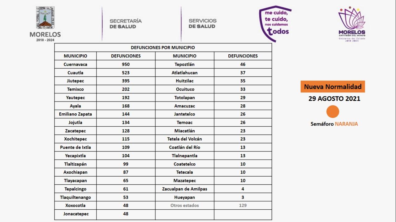 La Secretaría de Salud informó este domingo en un comunicado que a la fecha en Morelos se han estudiado 192 mil 711 personas, de las cuales se han confirmado 42 mil 71 con coronavirus covid-19; mil 85 están activas y se han registrado cuatro mil 123 defunciones.