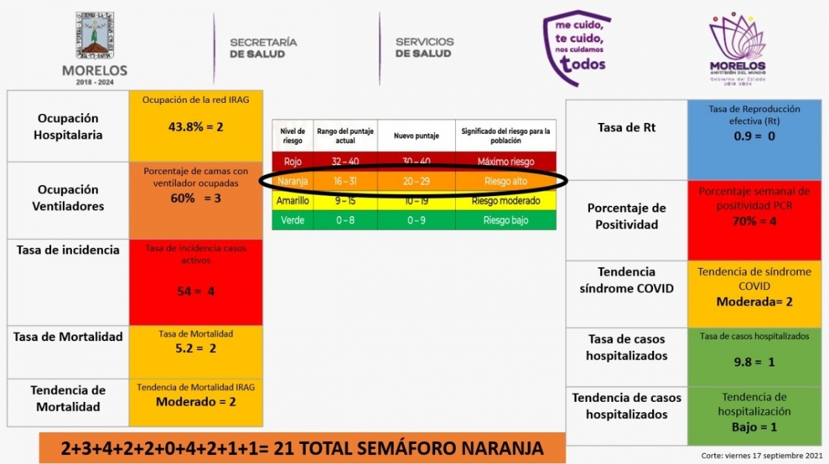 La Secretaría de Salud dio a conocer este viernes en un comunicado que de acuerdo al simulador del semáforo de riesgo epidémico, Morelos podría quedar en color naranja durante las siguientes dos semanas; sin embargo, será la autoridad sanitaria federal quien informe de manera oficial.