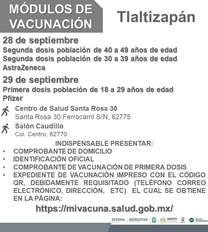 En Tlaltizapán y Coatetelco se completará esquema de vacunación en personas de 30 a 39 años y de 40 a 49 años con la vacuna AstraZeneca, el martes 28 de septiembre; en Tetecala para este mismo segmento únicamente se realizará el miércoles 29 de septiembre, también con el biológico AstraZeneca.