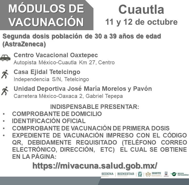 En Cuautla, la inmunización de segundas dosis de AstraZeneca en las personas de 30 a 39 años se desarrollará también el lunes 11 y martes 12 de octubre a partir de las 10:00 horas y hasta concluir las dosis asignadas en: Centro Vacacional IMSS Oaxtepec, autopista México-Cuautla, kilómetro 27, Centro (vehicular); casa ejidal Tetelcingo, Independencia S/N, Tetelcingo; unidad deportiva José María Morelos y Pavón, carretera México-Oaxaca 2, Gabriel Tepepa.
