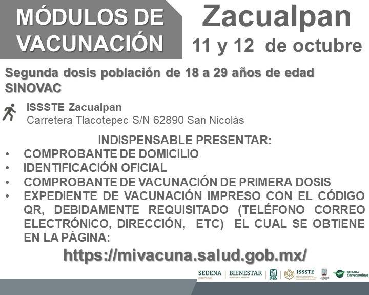 En Zacualpan de Amilpas se completará esquema de vacunación con Sinovac en personas de 18 a 29 años también el lunes 11 y martes 12 de octubre, a partir de las 10:00 horas en: ISSSTE Zacualpan, carretera Tlacotepec S/N, 62890 de San Nicolás.
