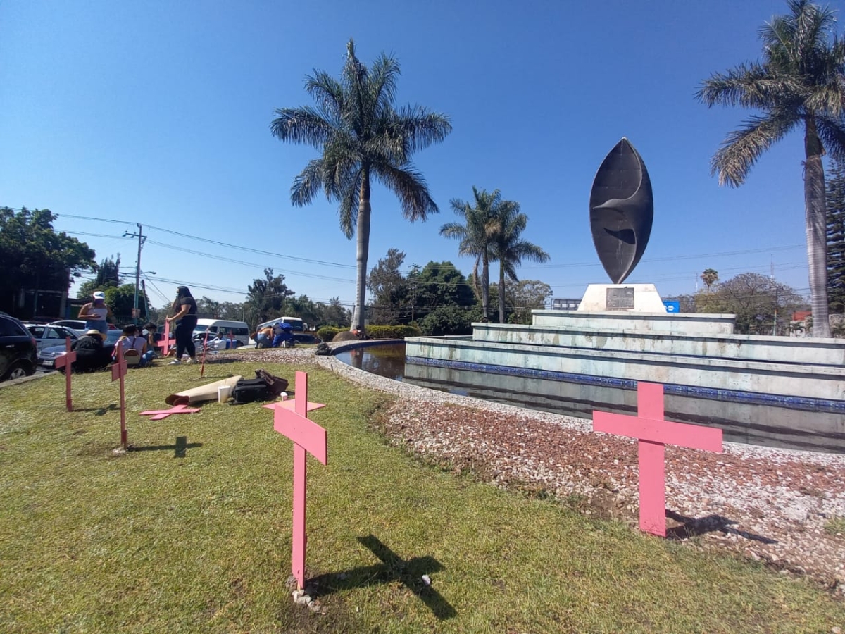Estudiantes de la Universidad Autónoma del Estado de Morelos (UAEM) y colectivos de mujeres colocaron este sábado 71 cruces en la glorieta de la Paloma de la Paz, por el número de mujeres asesinadas durante el año 2021 y exigieron justicia.