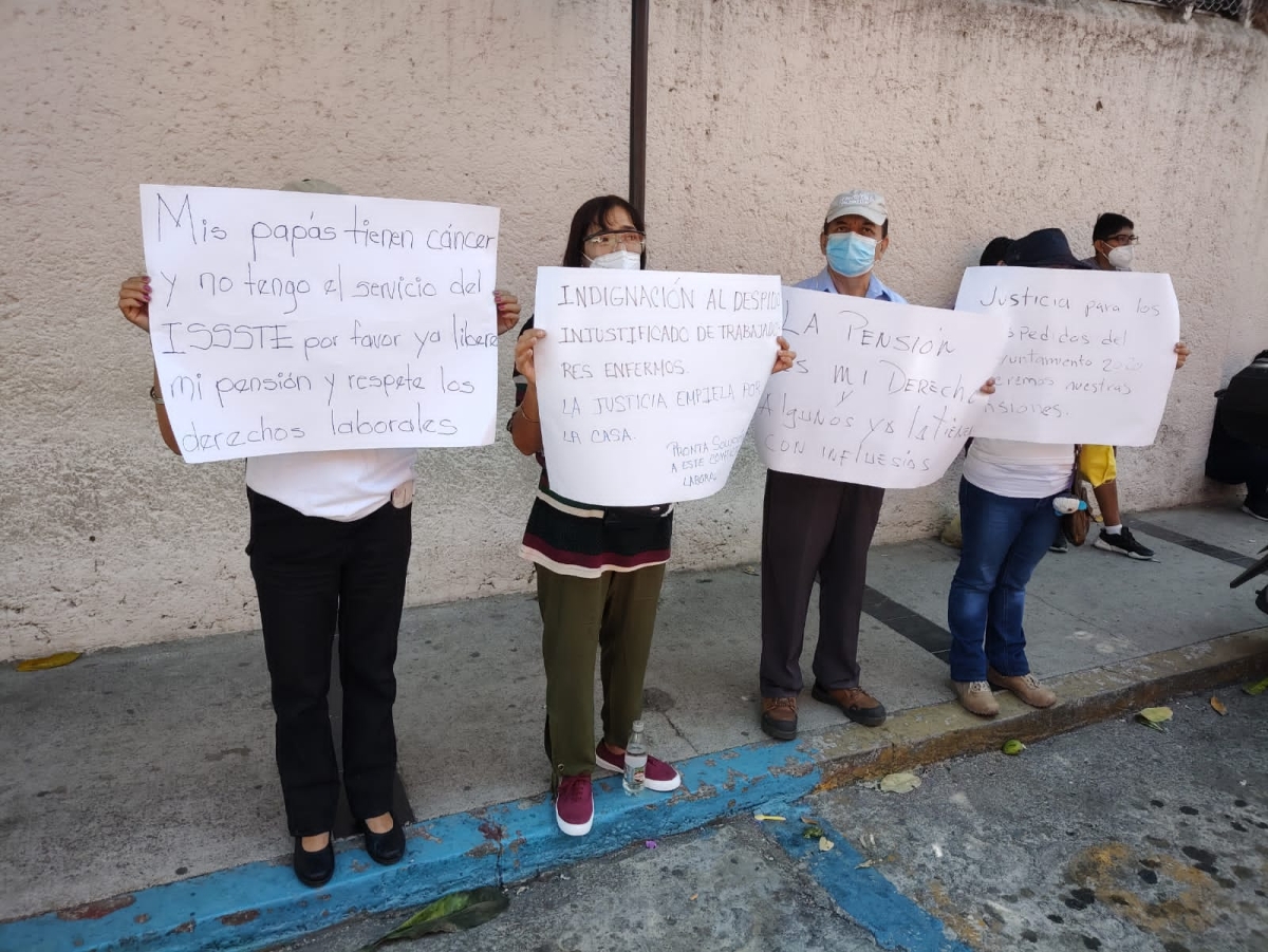 Ex trabajadores del Ayuntamiento de Cuernavaca se manifiestan este miércoles en el palacio municipal.