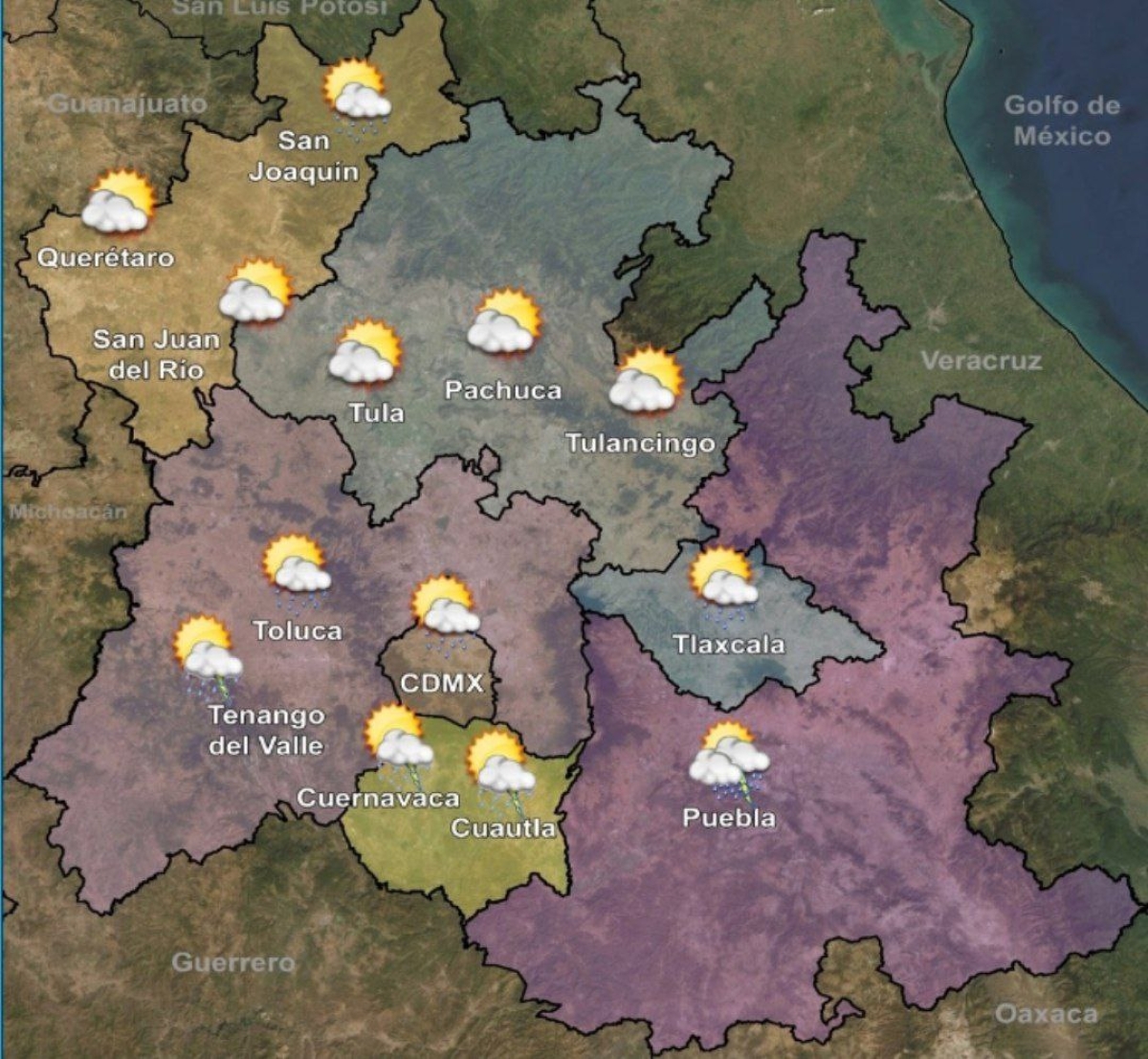 Para este viernes, en Morelos predominará tiempo relativamente variable, con cielo medio nublado a nublado y, aunque se espera una disminución en el potencial de lluvias, no se descartan chubascos con acumulados de 0.1 a 25 mm, de manera dispersa en la entidad. Los valores de temperatura, con máximas de 23 a 34 °C, favorecerán un ambiente diurno templado a ligeramente cálido, fresco a frío por la mañana, esto último en localidades serranas del norte. Se esperan vientos mayormente del sur, con velocidades de 10 a 15 km/h.