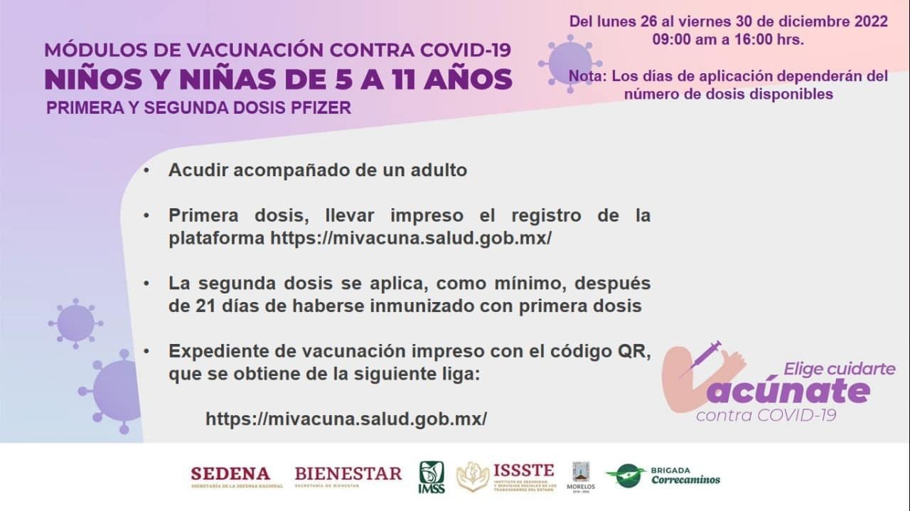 También, la dependencia refirió que continúa la vacunación contra covid-19 a niñas y niños de 5 a 11 años de edad, al viernes 30 de diciembre del 2022, en un horario de 09:00 a 16:00 horas.