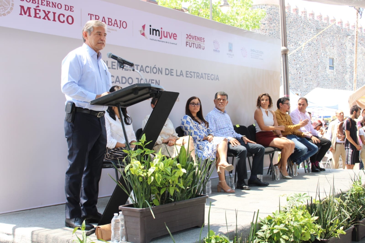 El alcalde de Cuernavaca, José Luis Urióstegui Salgado, y autoridades de la Secretaría de Bienestar inauguraron este miércoles un módulo móvil para la incorporación de "Jóvenes Construyendo el Futuro"; se ubica a un costado de la plaza de armas en el centro de Cuernavaca.