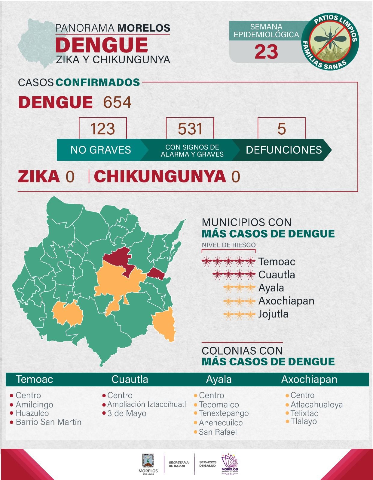 A la semana epidemiológica 23 se han registrado 654 casos acumulados de dengue, de los cuales 123 están clasificados como no graves y 531 con signos de alarma y graves, así como cinco lamentables defunciones; hasta el momento, no se tienen registrados casos de zika y chikungunya.