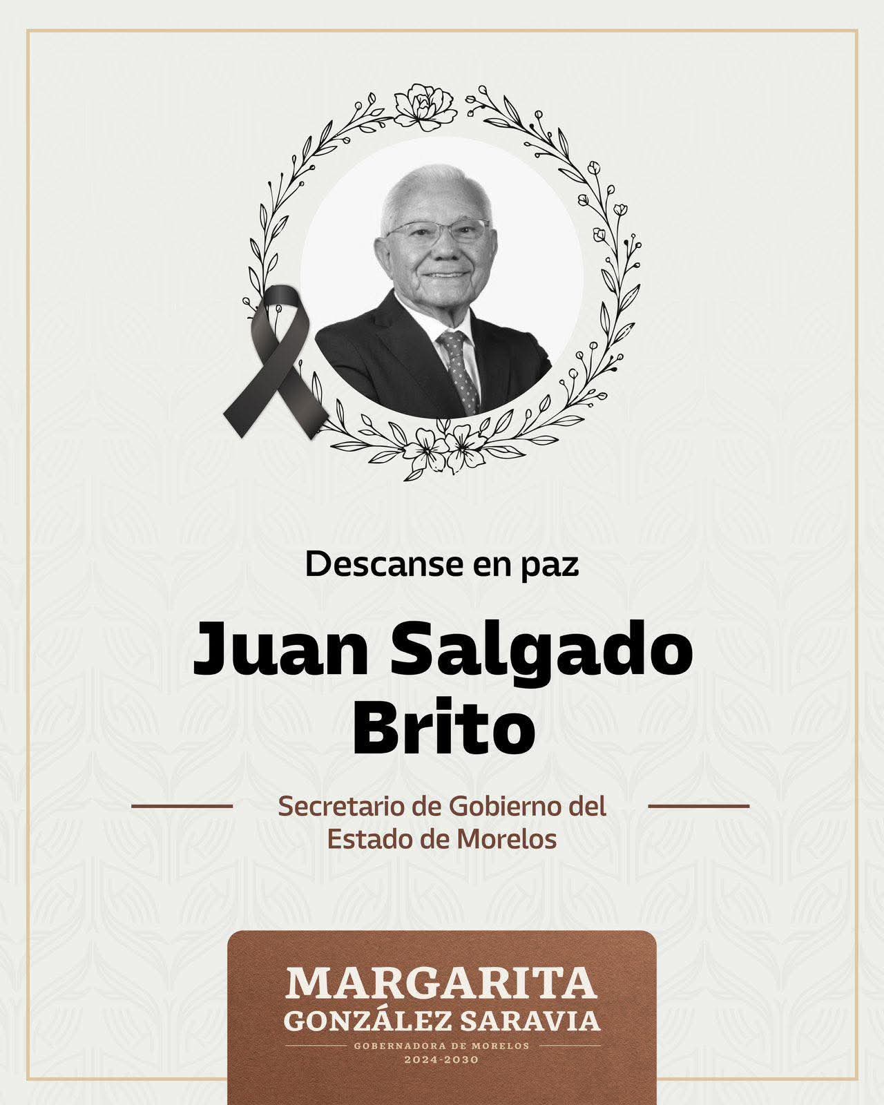 "Lamento profundamente el fallecimiento del doctor Juan Salgado Brito, secretario de Gobierno del estado de Morelos. Un hombre de profundas convicciones, comprometido con el desarrollo de Morelos y con las causas sociales, que marcaron su trayectoria.