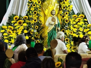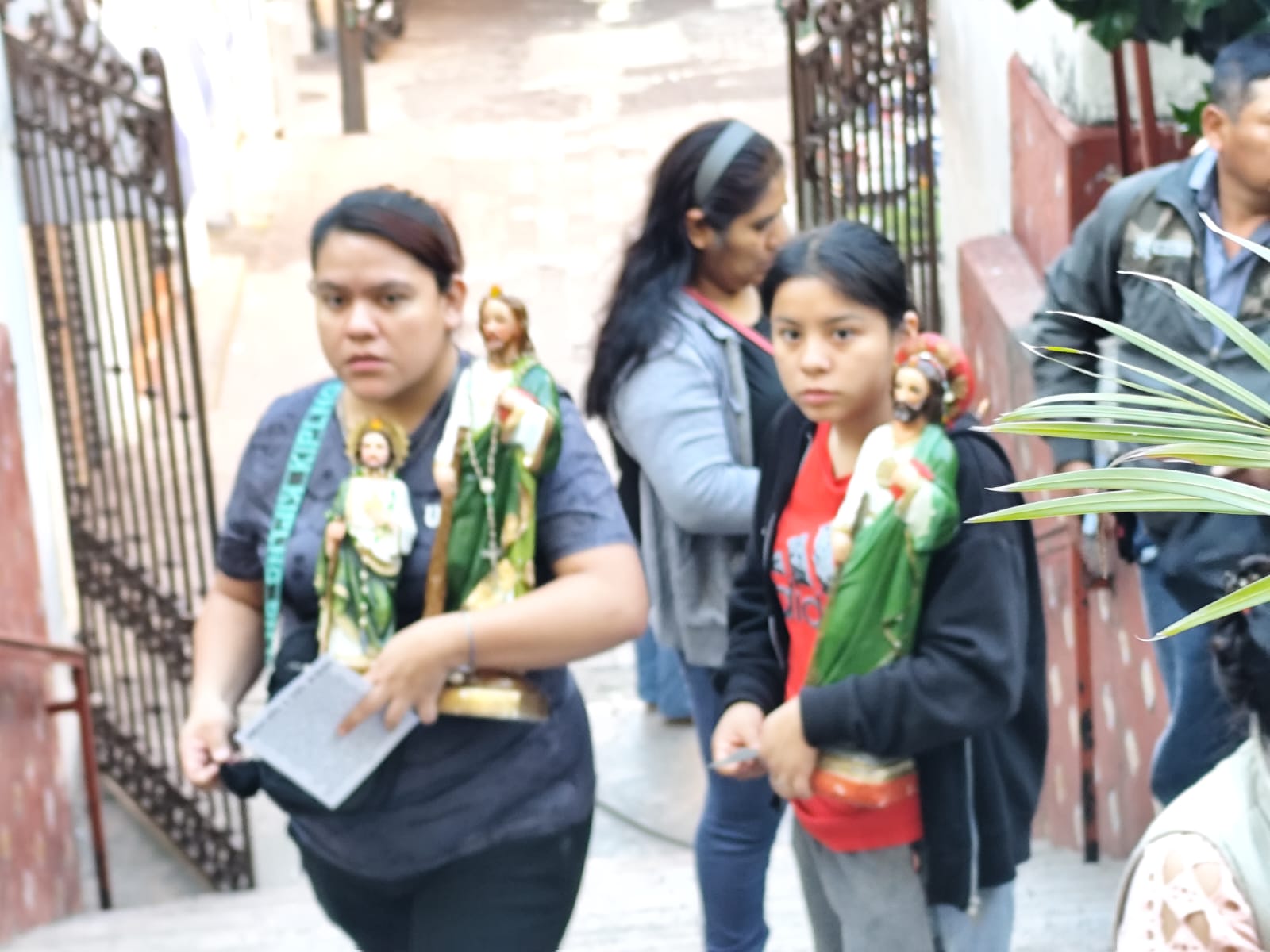 Las familias acuden con veladoras y la imagen religiosa, otras personas llegan con vestimenta alusiva al santo de las causas imposibles.