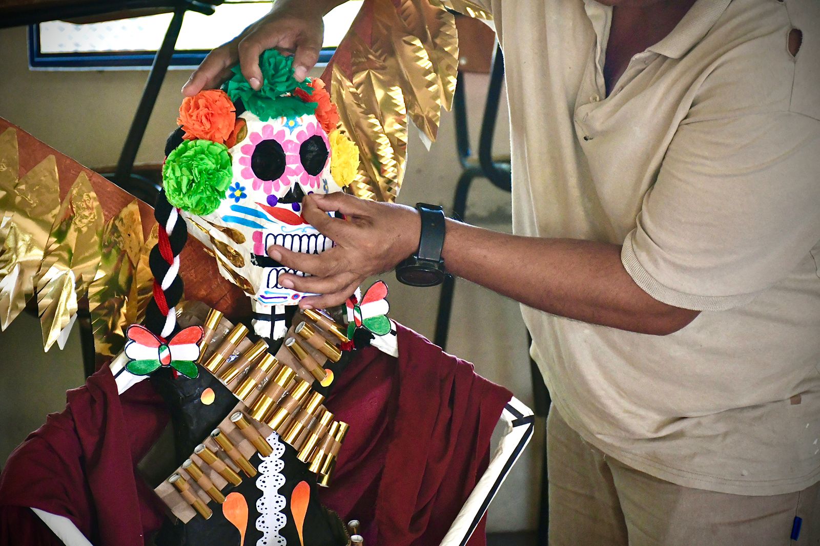 Asimismo, describió cómo elaboraron unas catrinas con vestido blanco, la cual representaba a una novia lista para casarse, comenzaron haciendo su cuerpo con cartón y luego rellenaron con papel periódico y pegamento, hasta que fuese agarrando la forma deseada.