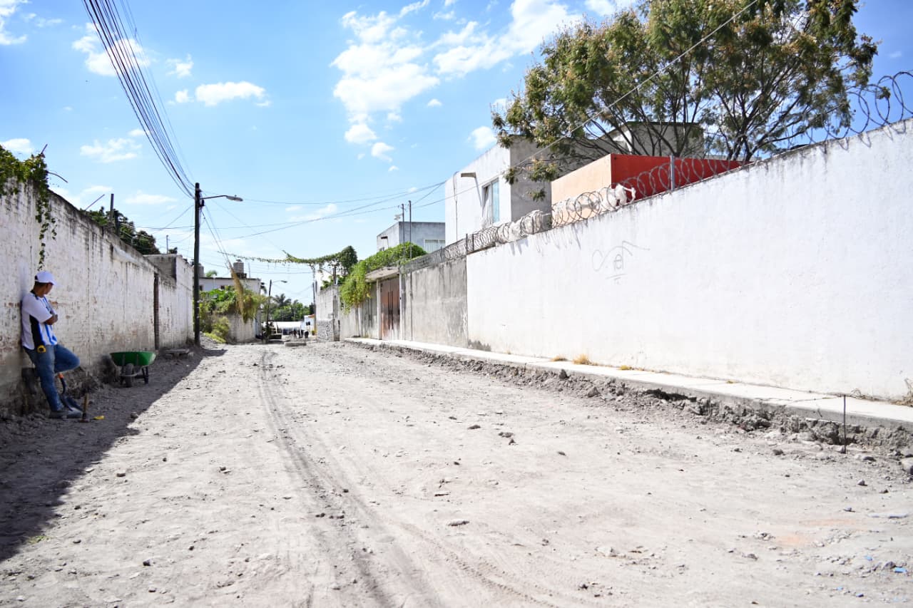 Los trabajos incluyen excavación, compactación del terreno, colocación de material de banco, pavimentación de 15 centímetros de espesor con concreto hidráulico, nivelación de pozos de visita y señalización horizontal.