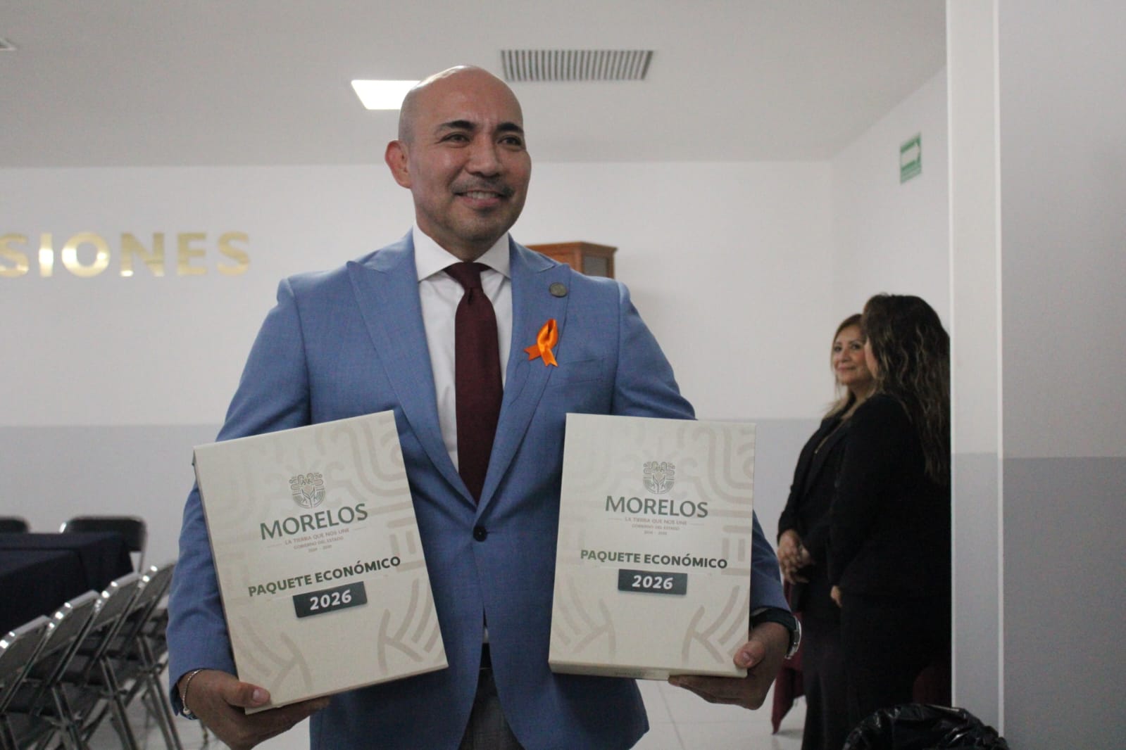 El secretario de Administración y Finanzas del gobierno del estado, Jorge Salazar Acosta, entrega esta mañana el paquete económico 2026 del Ejecutivo local al Congreso de Morelos.