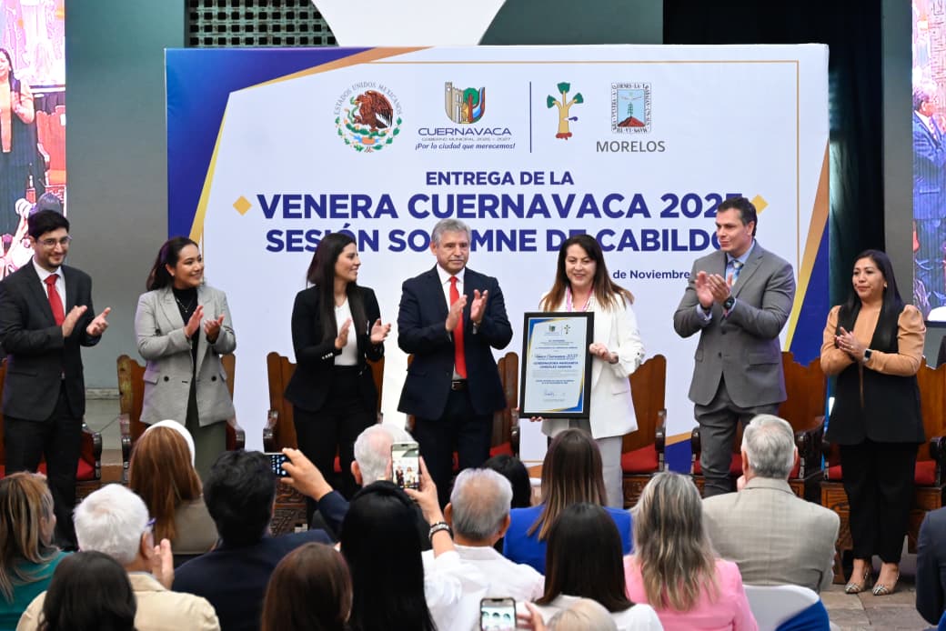 La gobernadora de Morelos, Margarita González Saravia, recibió la distinción Venera Cuernavaca 2025, otorgada por el ayuntamiento capitalino durante sesión solemne de cabildo realizada en el Museo de la Ciudad. En este acto fue reconocida por su liderazgo, vocación de servicio y por marcar un hecho histórico al convertirse en 2024 en la primera mujer en encabezar el Poder Ejecutivo estatal.