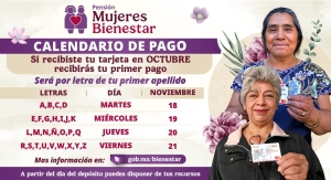 La Secretaría de Bienestar dio a conocer que del 18 al 21 de noviembre se liberarán los pagos a las mexicanas de entre 60 y 64 años de edad que se registraron en agosto a la Pensión Mujeres Bienestar y recibieron su tarjeta en octubre.