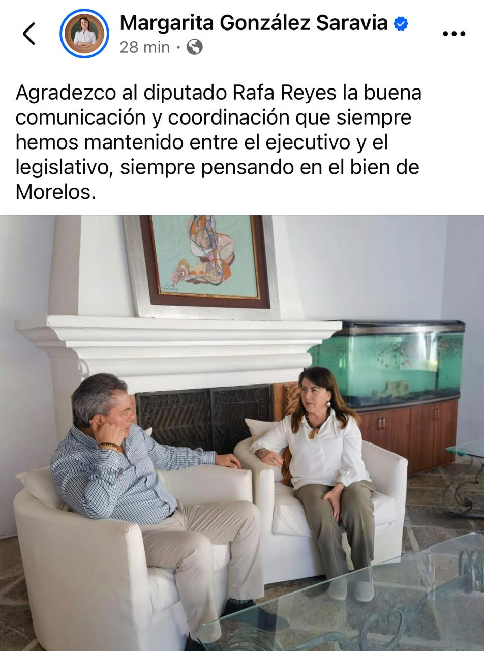 La gobernadora Margarita González Saravia se reunió con el diputado Rafael Reyes Reyes, coordinador del grupo parlamentario de Movimiento de Regeneración Nacional (Morena) en el Congreso del estado.