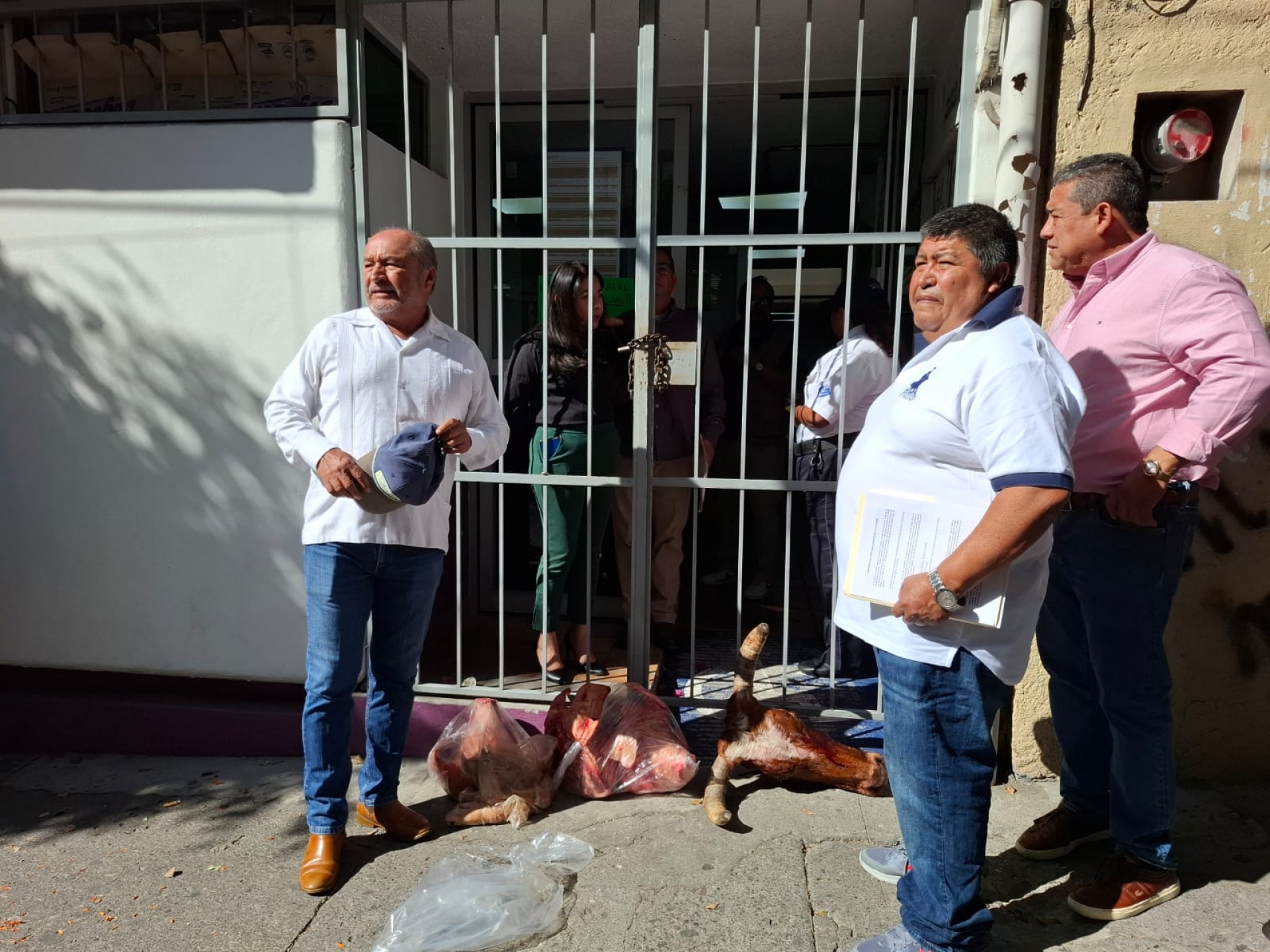 Tablajeros de Cuernavaca protestan en la Comisión para la Protección contra Riesgos Sanitarios del Estado de Morelos (Coprisem), al señalar que la instancia pretende cerrar el rastro capitalino.