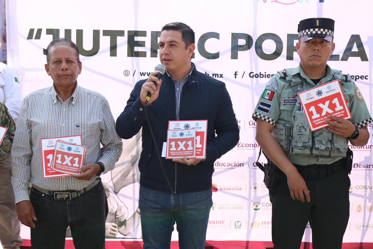 El alcalde de Jiutepec, Eder Rodríguez Casillas, encabezó el arranque de la campaña vial 1x1, para fortalecer la cultura del respeto entre conductores y promover una movilidad más segura en el municipio.