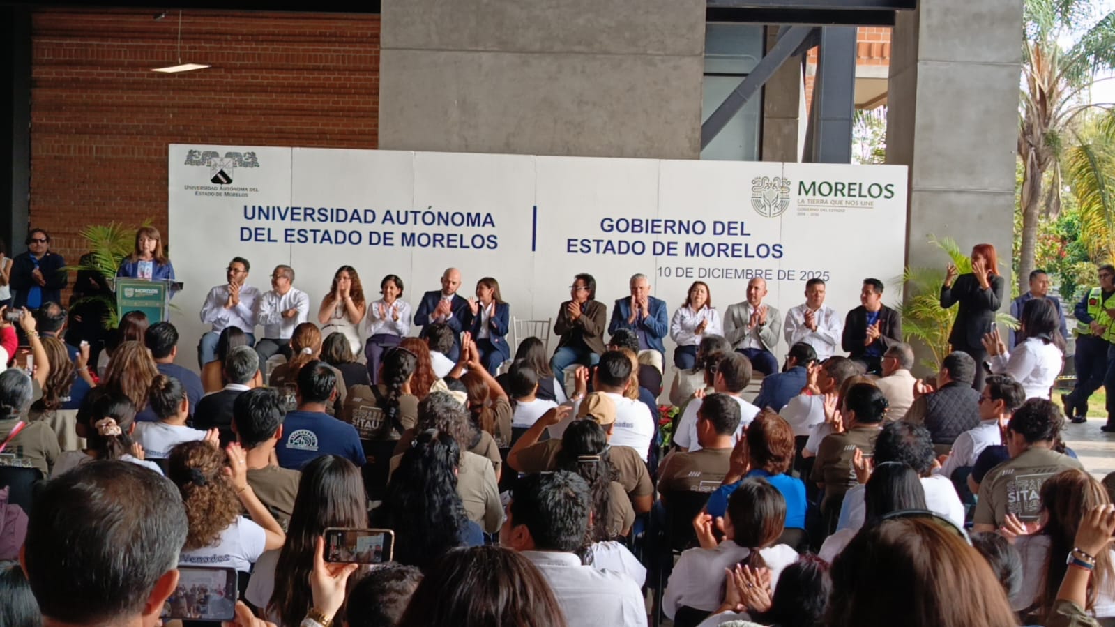 En un encuentro realizado en la explanada del edificio uno del campus Chamilpa de la UAEM, con la presencia del gabinete del gobierno estatal y de la administración central universitaria, se dio este anuncio, el cual la base trabajadora congregada en este espacio celebró con júbilo.