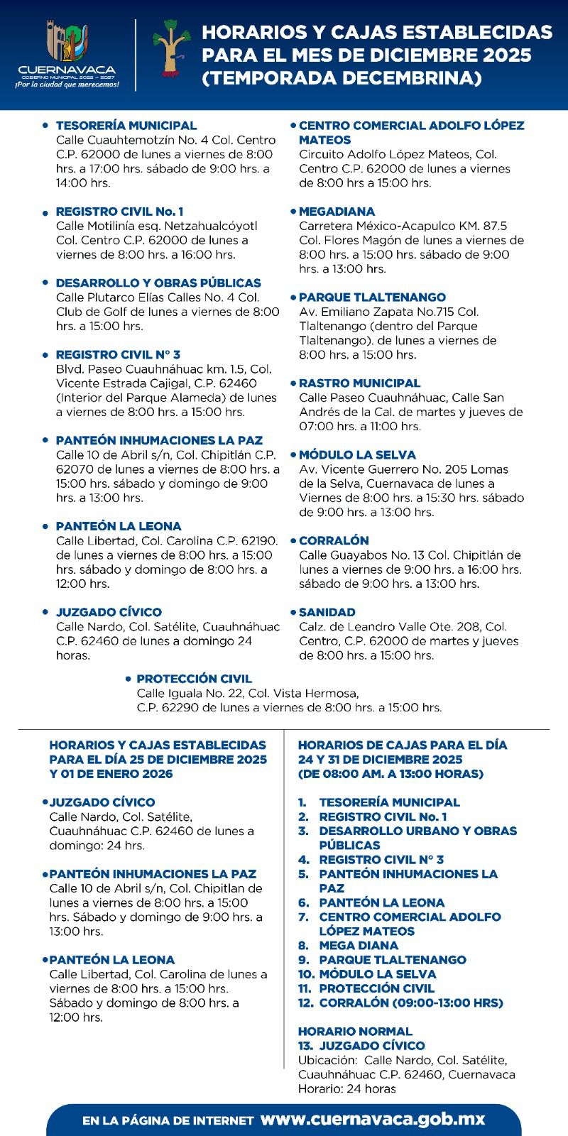 Con el propósito de brindar mayores facilidades durante la temporada decembrina, el Ayuntamiento mantiene habilitadas diversas cajas de cobro en distintos puntos del municipio, incluyendo la Tesorería Municipal, que el 24 de diciembre brindará atención en un horario especial de 8:00 a 14:00 horas.