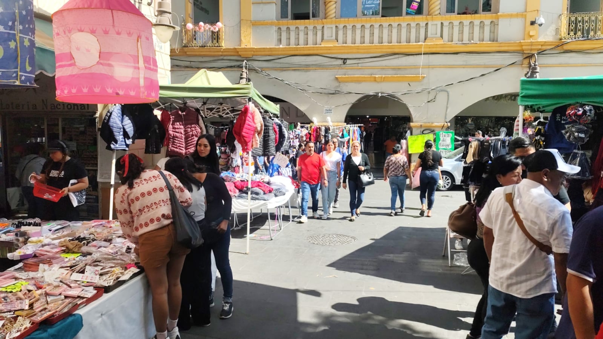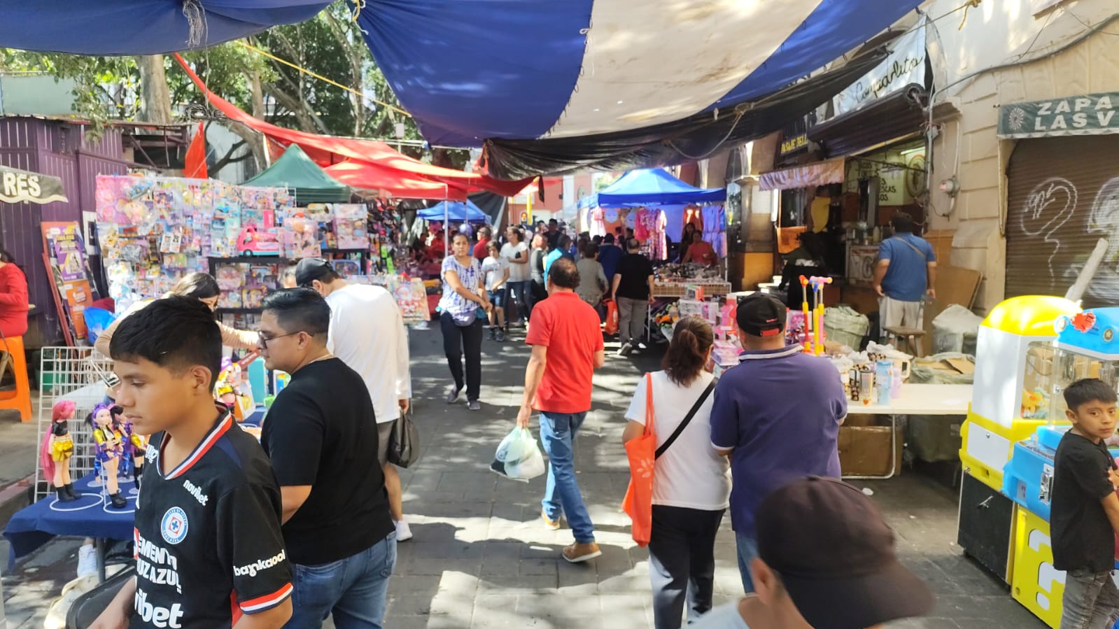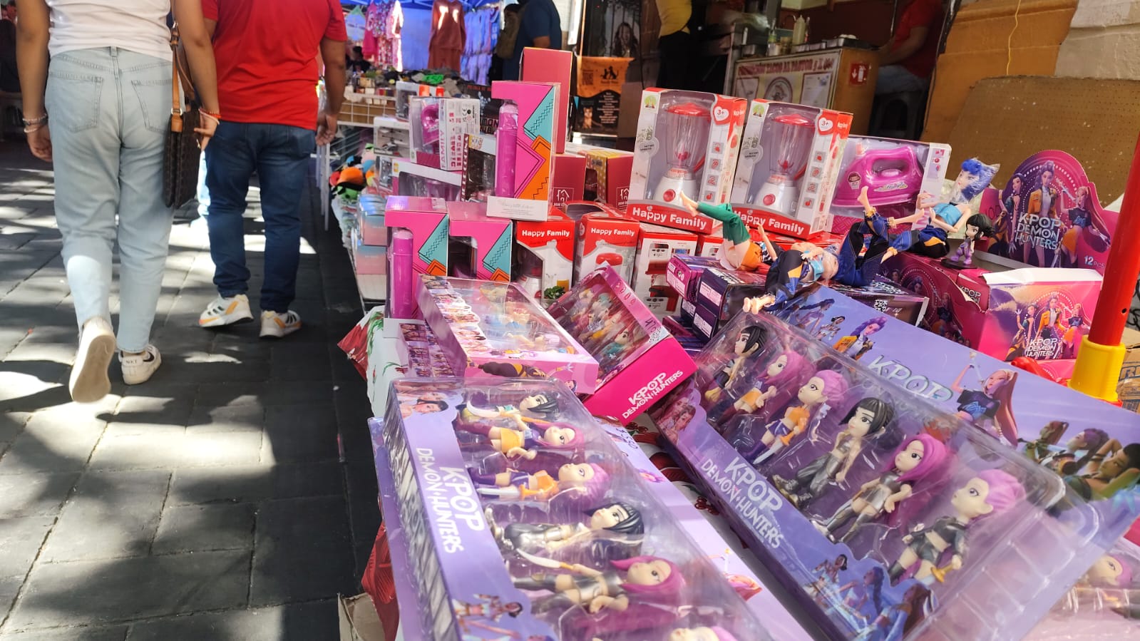 Comerciantes instalaron su mercancía en la calle ubicada junto al edificio Bellavista, en el centro de Cuernavaca, como parte del tianguis navideño; venden comida, ropa y juguetes, así como artículos de temporada.