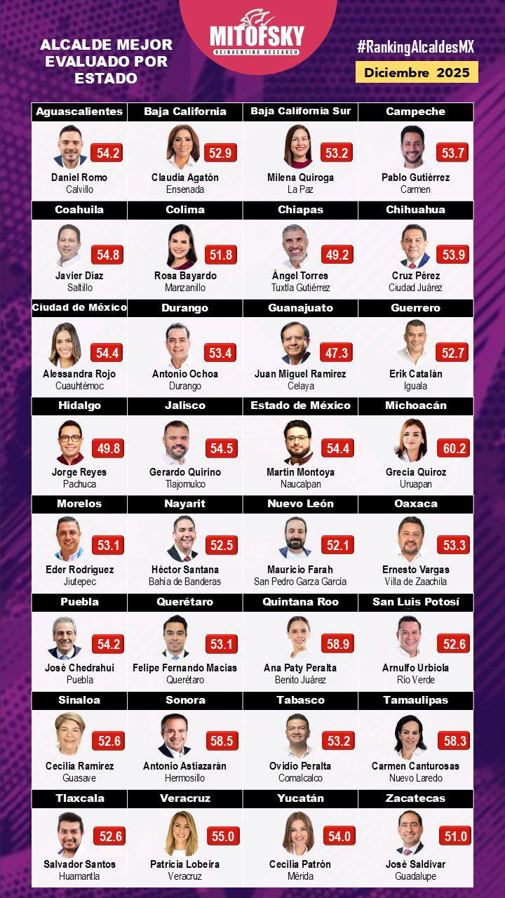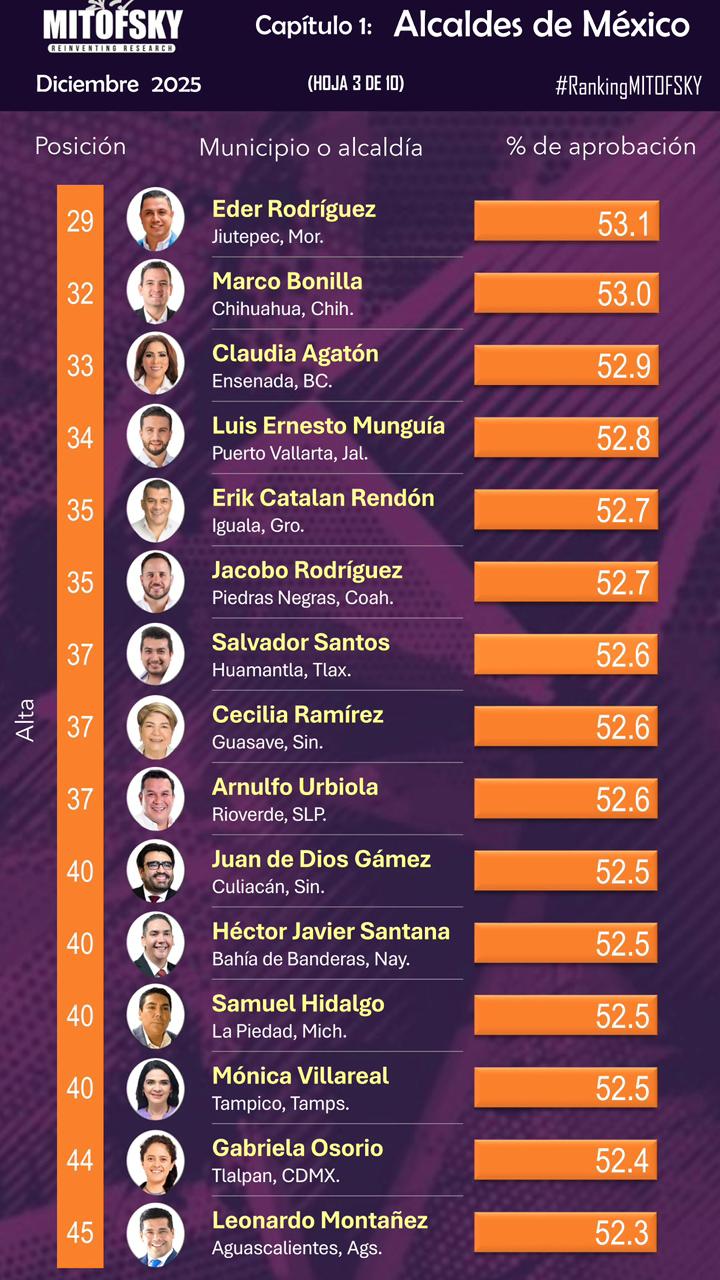El ranking de los 150 alcaldes evalúa el desempeño, los resultados y la aprobación ciudadana de los presidentes y presidentas municipales.