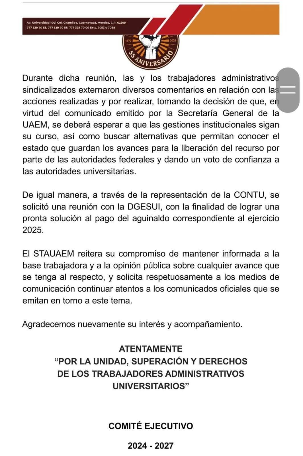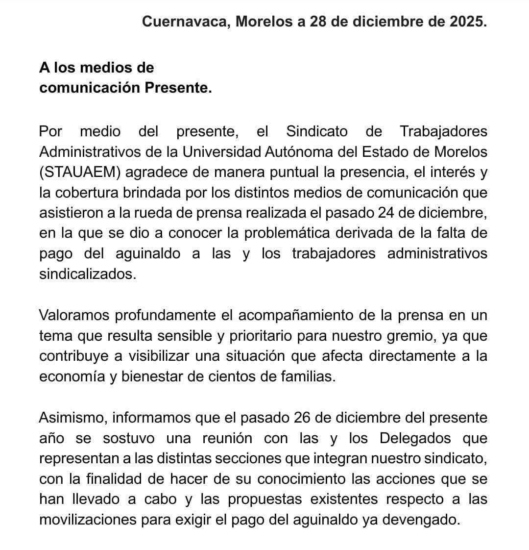 Mediante un comunicado, el STAUAEM informó que la decisión responde al voto de confianza otorgado a las negociaciones que sostiene el gobierno Morelos ante el gobierno federal, con la expectativa de avanzar en el diálogo y alcanzar acuerdos favorables.