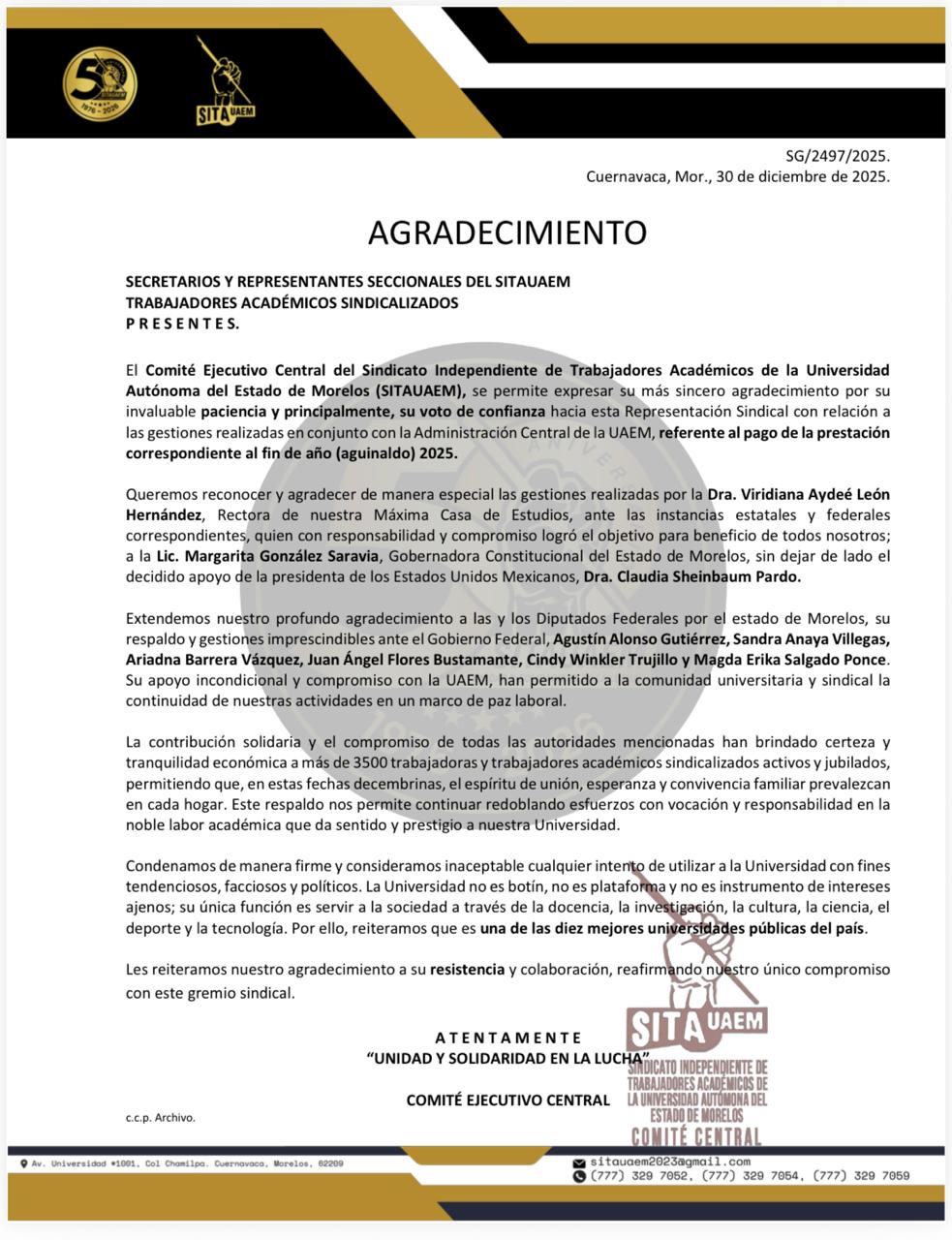 El Sindicato Independiente de Trabajadores Académicos de la Universidad Autónoma del Estado de Morelos (SITAUAEM) agradeció a la presidenta Claudia Sheinbaum Pardo, a la gobernadora Margarita González Saravia, legisladoras y legisladores, así como autoridades universitarias, por las gestiones que permitieron el pago del aguinaldo 2025 a personal académico sindicalizado, lo que les brinda certeza y tranquilidad.