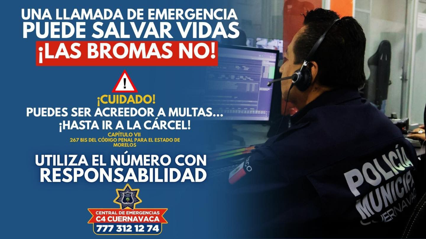 Ante cualquier situación de emergencia marcar al número del C4, el 777-312-12-74 disponible las 24 horas, o a través de la aplicación gratuita "Cuernavaca Segura" disponible para iOS y Android.