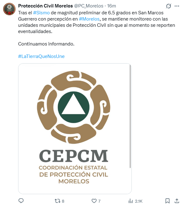A través de redes sociales, la Coordinación Estatal de Protección Civil Morelos (CEPCM) dio a conocer su reporte sobre el sismo registrado la mañana de este viernes, indicando que no se reportan eventualidades.
