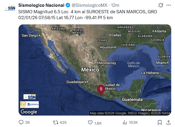 De acuerdo con el Servicio Sismológico Nacional (SSN), el sismo tuvo una magnitud de 6.5, localizado cuatro kilómetros al suroeste de San Marcos, Guerrero, y fue perceptible en diversas zonas de la entidad morelense.