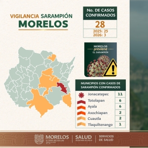 La Secretaría de Salud de Morelos, a través de Servicios de Salud de Morelos (SSM), informó que, durante la primera semana epidemiológica de 2026, se confirmaron tres casos de sarampión en la localidad de Tenextepango, municipio de Ayala.