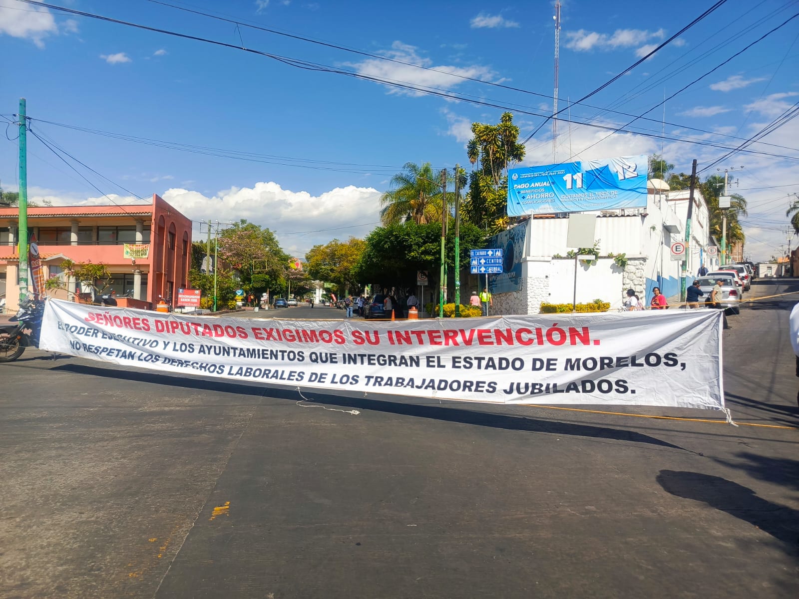 Jubilados del Sistema de Agua Potable y Alcantarillado de Cuernavaca (SAPAC) llevan a cabo un bloqueo en la avenida Morelos, en el centro de la capital morelense, para pedir el pago de sus prestaciones.