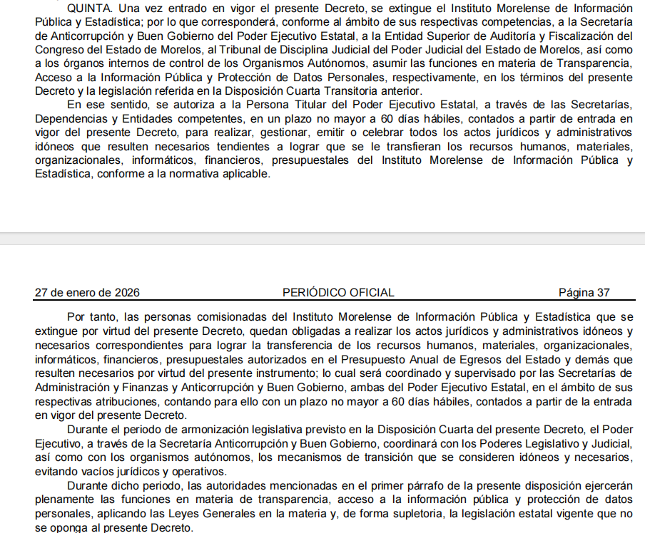 La extinción del Instituto Morelense de Información Pública y Estadística (IMIPE) quedó formalizada con la publicación del Decreto 1105 en el Periódico Oficial "Tierra y Libertad", lo que marca el fin de un modelo que operó durante años como órgano autónomo en acceso a la información y protección de datos personales.