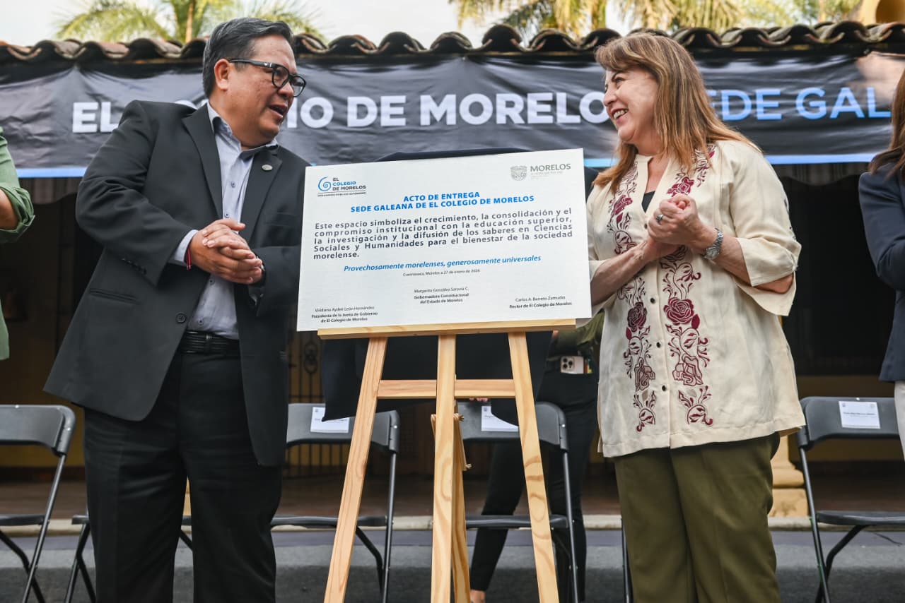 La gobernadora Margarita González Saravia encabezó la entrega de la sede Galeana a El Colegio de Morelos, con lo que la institución académica contará con un nuevo espacio para fortalecer sus programas de posgrado y licenciatura, así como para consolidar líneas de investigación en Ciencias Sociales y Humanidades en la entidad.