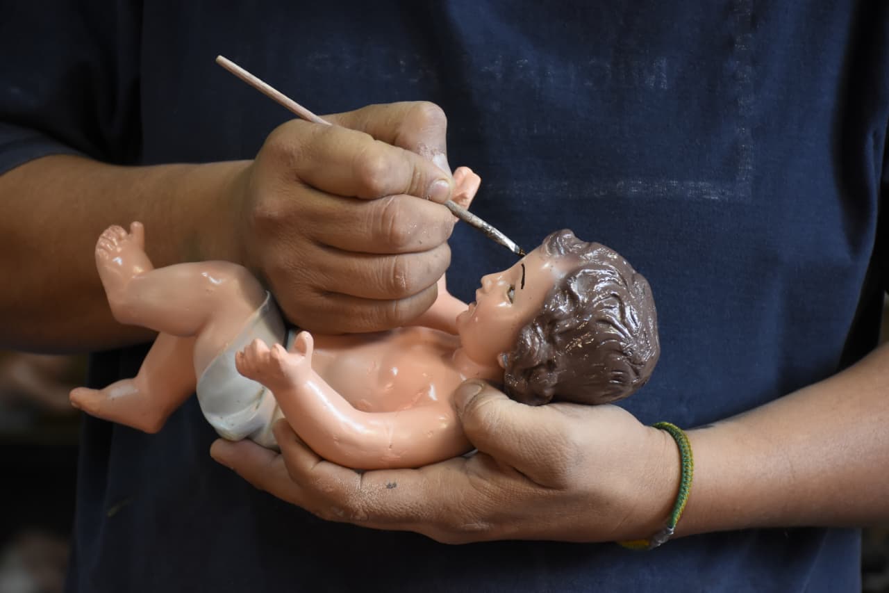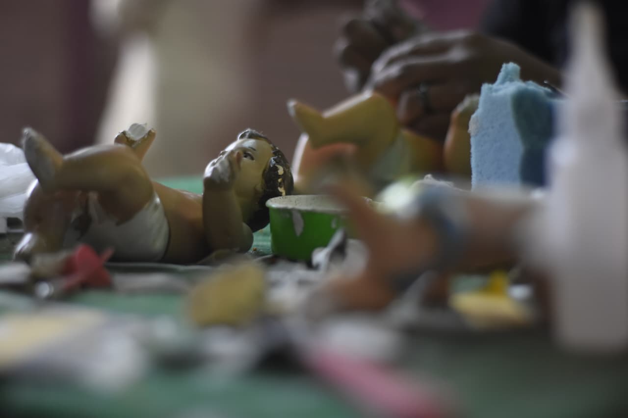 David Tapia restaura figuras de niño Dios desde hace 17 años, en el mercado Adolfo López Mateos (ALM); asegura que cada año es menor la demanda por este oficio, requerido ante la cercanía del Día de la Candelaria.