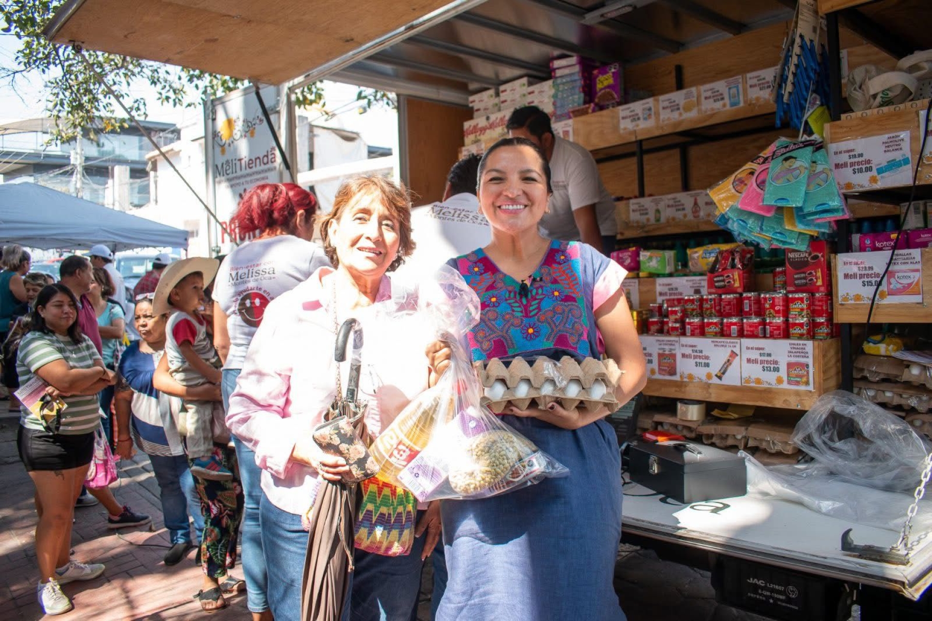 A través de la MeliTienda, la legisladora lleva a distintas colonias más de 70 productos de la canasta básica a precios accesibles, gracias a un subsidio que ella misma aporta para reducir el costo final a las familias. Entre los artículos que se ofrecen se encuentran arroz, frijol, huevo, aceite, atún, así como productos de higiene personal y de limpieza para el hogar.