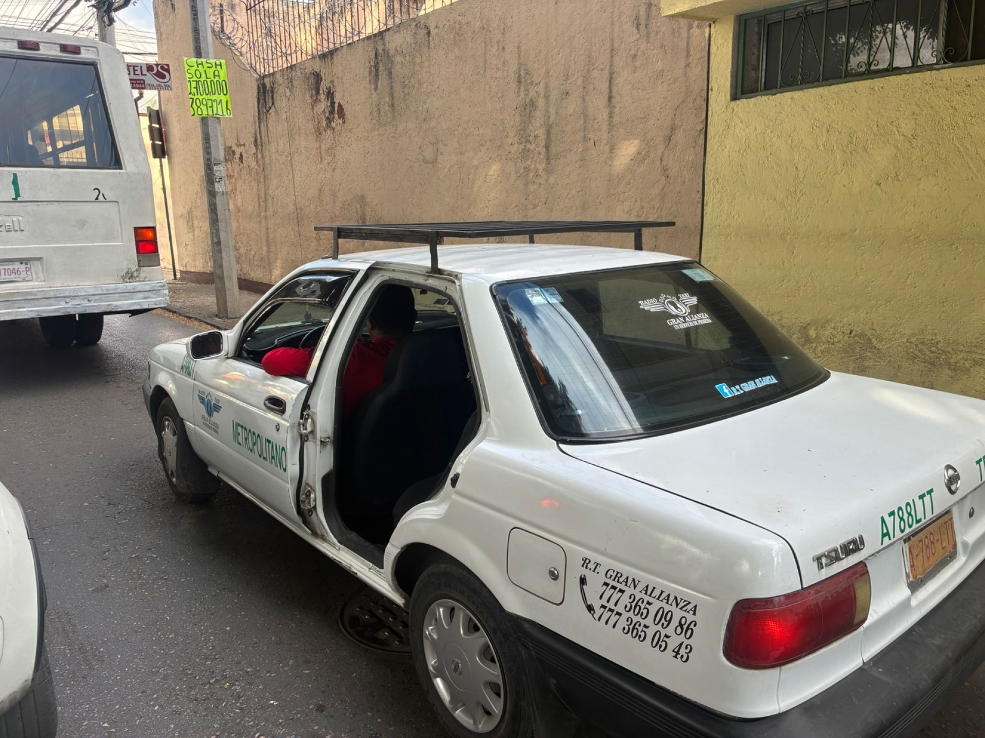 Un vehículo del sitio de radio taxi "Gran Alianza" fue visto hace una semana circulando sin una puerta sobre el bulevar Díaz Ordaz, esquina con Atlacomulco, en Cuernavaca.