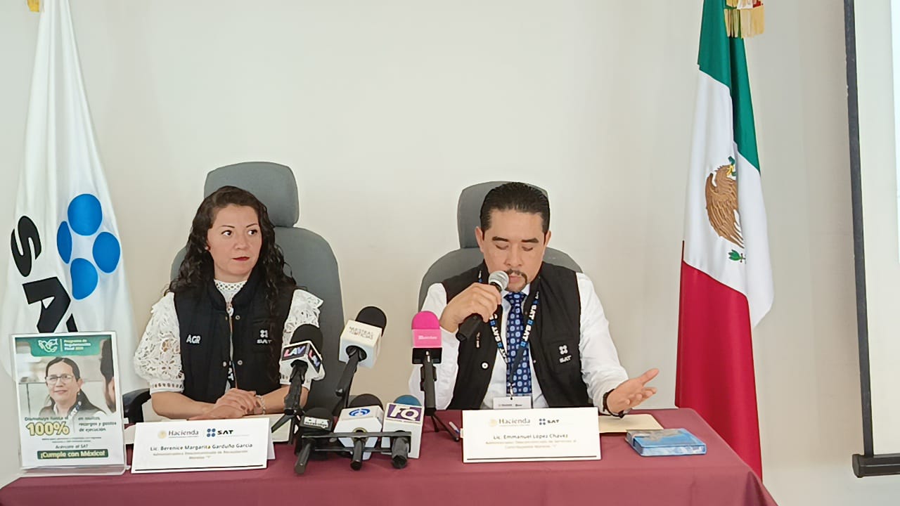 En rueda de prensa, Berenice Margarita Garduño García, Administradora Desconcentrada de Recaudación Morelos “1”, y Emmanuel López Chávez, Administrador Desconcentrado de Servicios al Contribuyente de Morelos "1", del Servicio de Administración Tributaria (SAT) dieron a conocer información clave para las y los contribuyentes en la entidad.