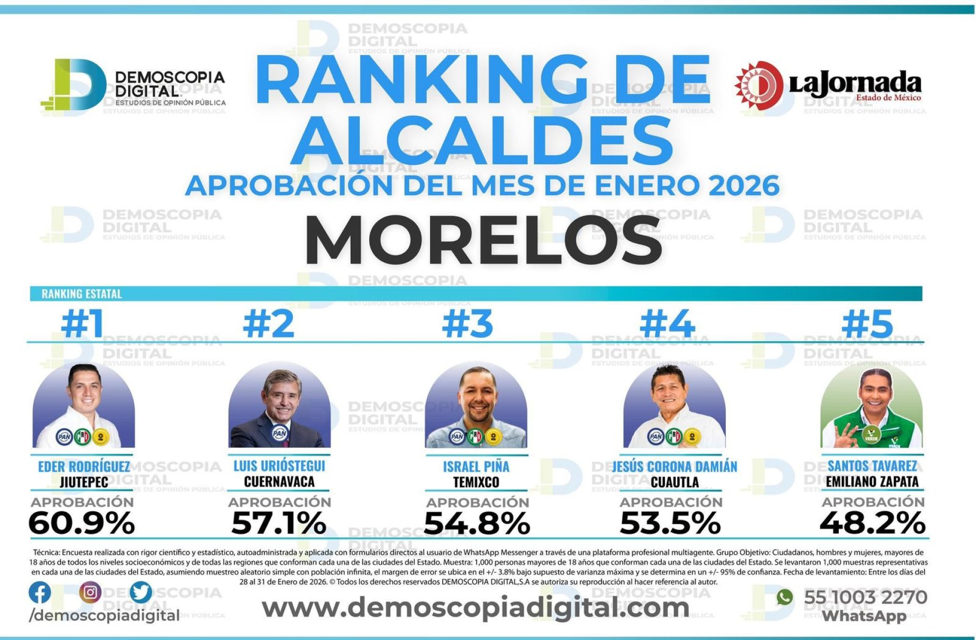De acuerdo con el más reciente tracking mensual de aprobación de Demoscopía Digital, correspondiente a enero de 2026, el alcalde de Jiutepec, Eder Rodríguez Casillas, registra un 60.9 por ciento de aprobación ciudadana.