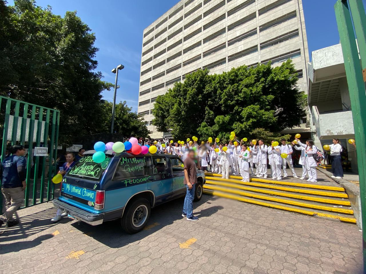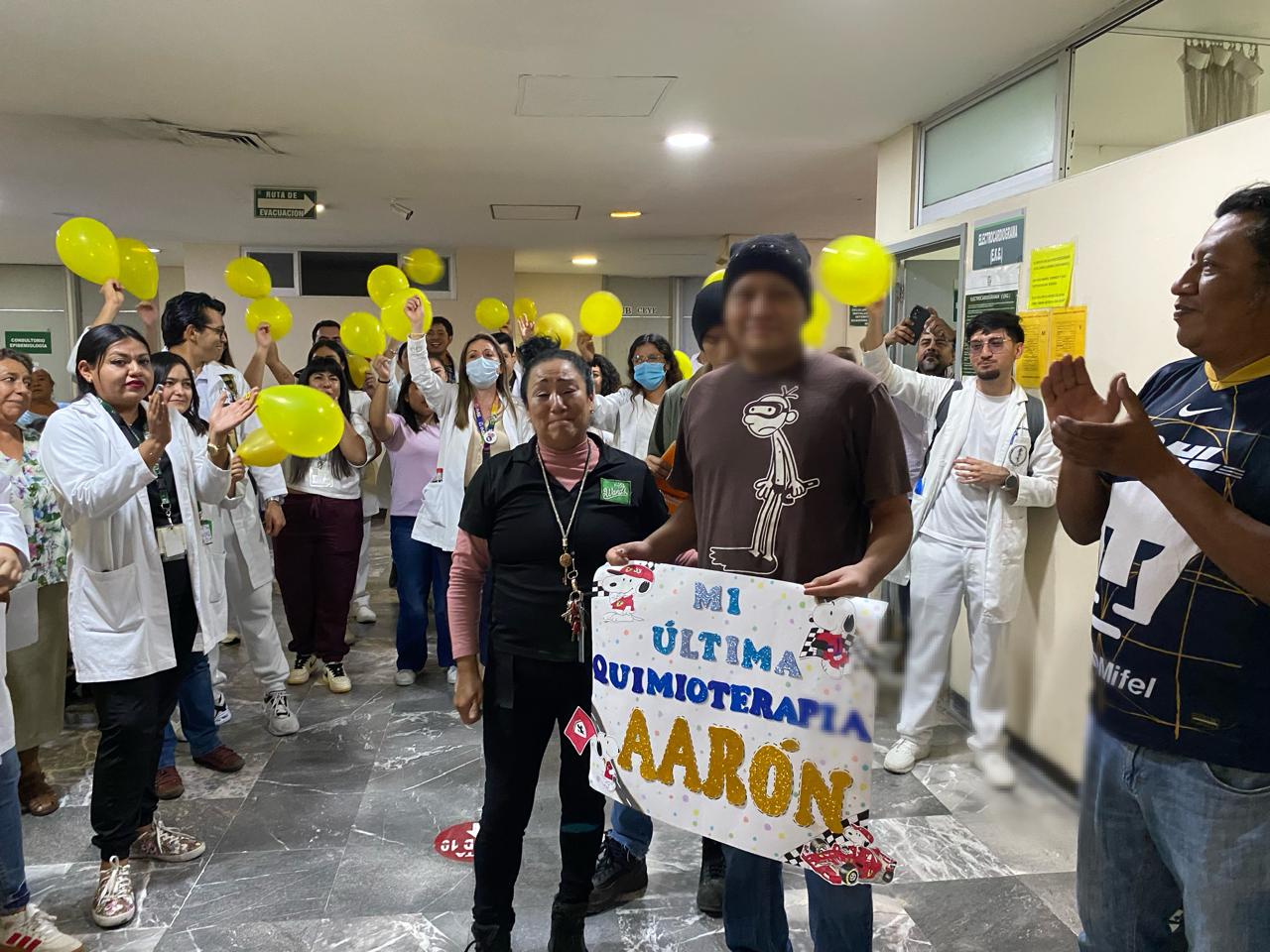 Como es tradición, las puertas del hospital del IMSS en Plan Ayala fueron abiertas a familiares y amigos que acompañaron a Aarón, ingresaron en medio de una valla formada por trabajadores y derechohabientes, posteriormente tocó la “Campana de la Victoria”, y plasmó su mano en el Árbol de la Vida.