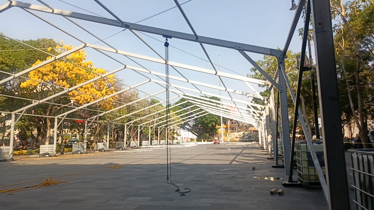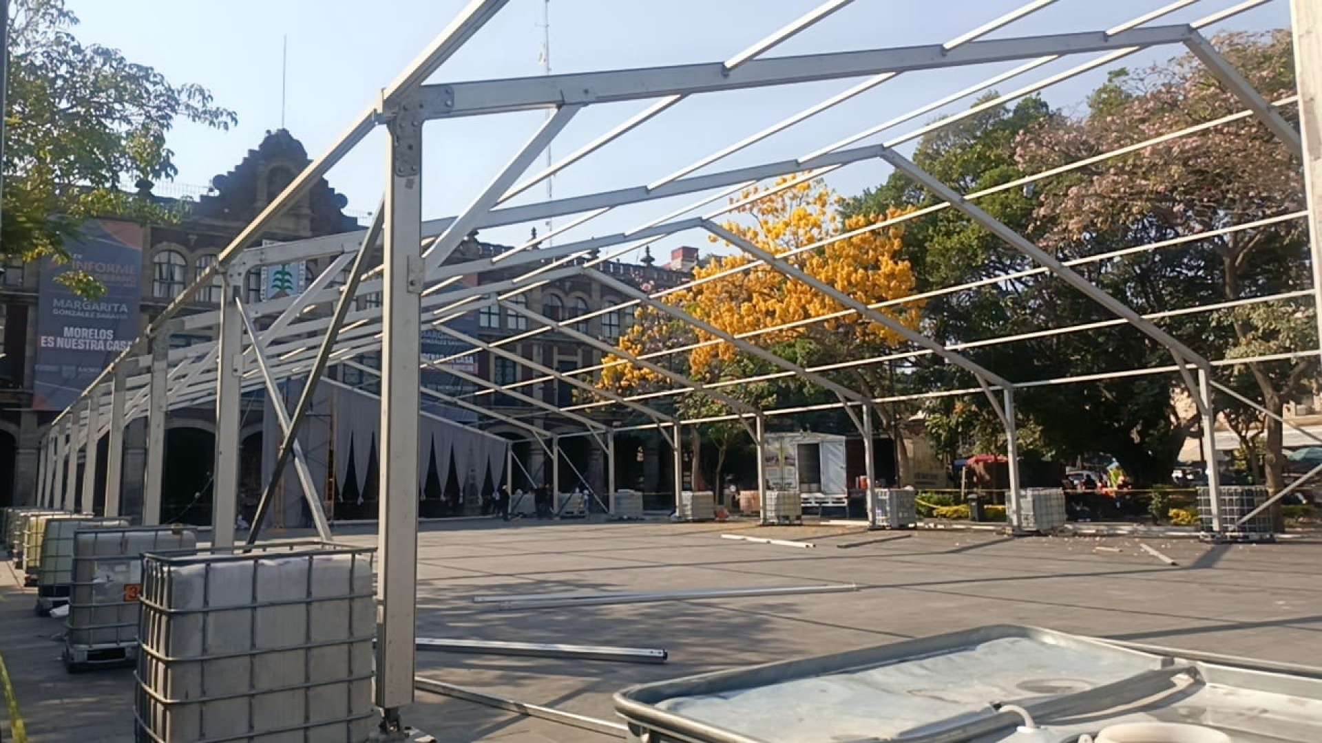 Avanzan los preparativos e instalación del templete en la plaza de armas de Cuernavaca para que, este domingo 15 de febrero, la gobernadora Margarita González Saravia rinda su Primer Informe de Gobierno en la capital morelense.