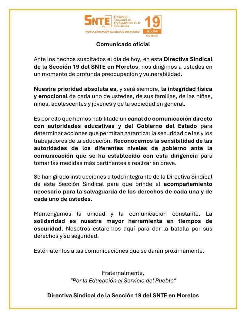La dirigencia de la sección 19 del Sindicato Nacional de Trabajadores de la Educación (SNTE) emitió un comunicado en el que anota que la representación acompañará a los docentes y que la prioridad es su seguridad e integridad.