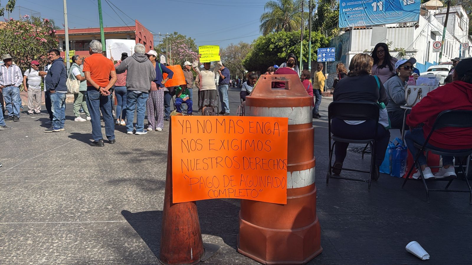 Jubilados del Sistema de Agua Potable y Alcantarillado de Cuernavaca (SAPAC) bloquean la avenida Morelos, a la altura de las oficinas del organismo operador, para demandar el pago completo del aguinaldo.
