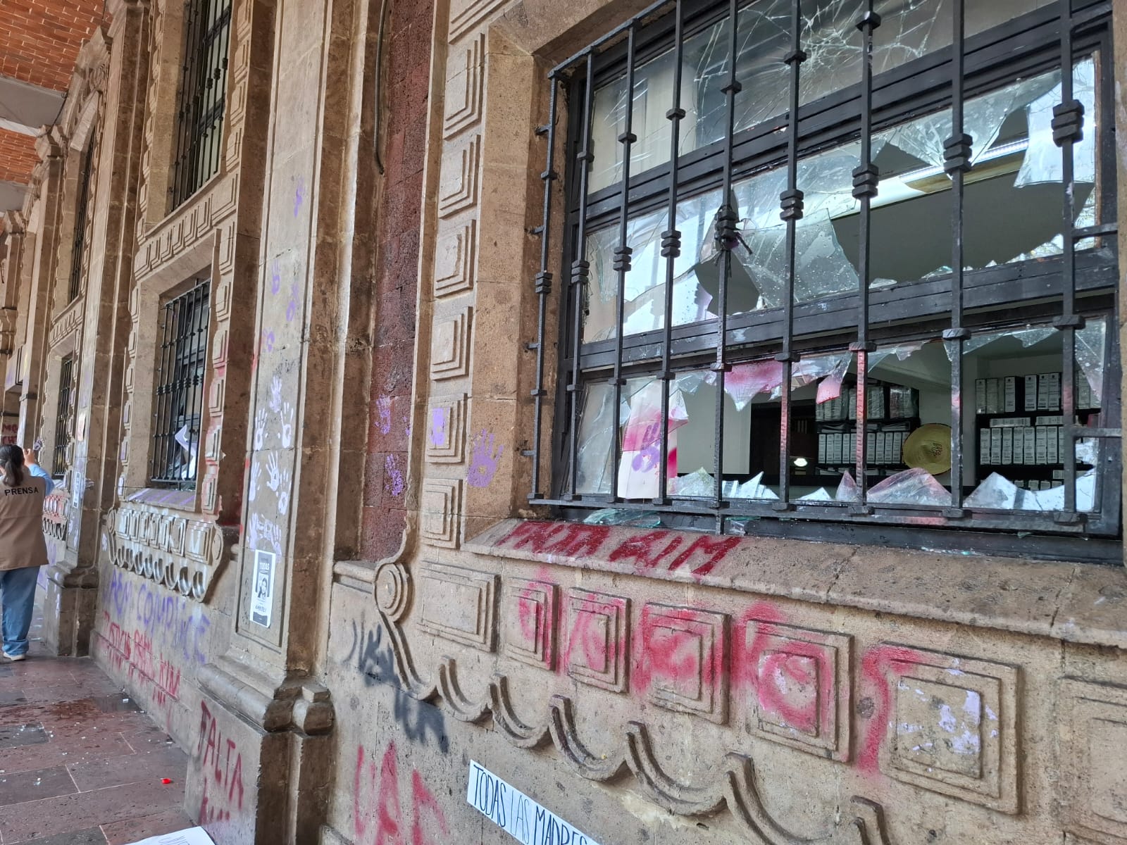Tras el arribo del contingente, algunos manifestantes lanzaron botellas de plástico y piedras a ventanales del palacio de gobierno, rompieron cristales y prendieron fuego en una de las ventanas, además de colocar pancartas y hacer pintas.