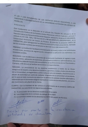 Como parte de los acuerdos de la asamblea virtual realizada ayer, representantes estudiantiles de la Universidad Autónoma del Estado de Morelos (UAEM) entregaron la Carta de Garantías de No Represalias a los integrantes de la Resistencia Estudiantil.