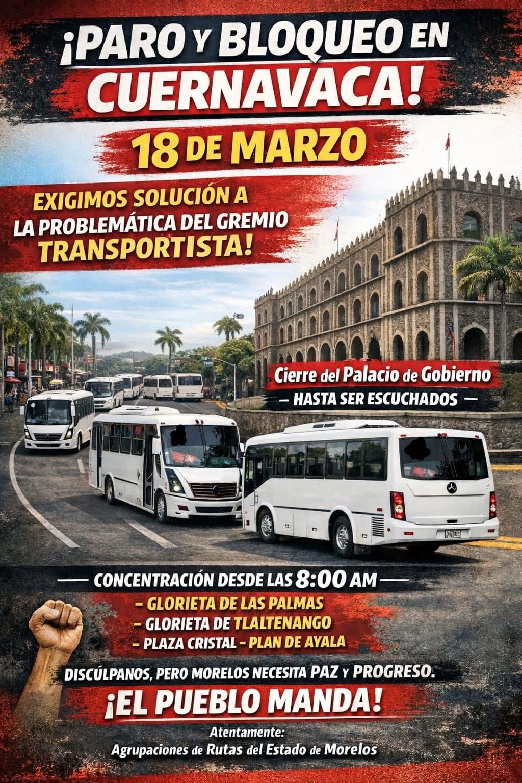 Transportistas de la zona metropolitana de Cuernavaca anunciaron una manifestación para este miércoles, en la explanada de la plaza de armas, para exigir al gobierno estatal un aumento de cinco pesos a la tarifa mínima del transporte público.